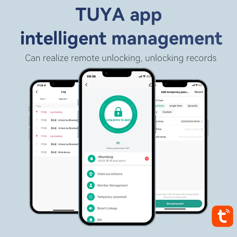 - पारंपरिक तरीके: विभिन्न उपयोगकर्ता आवश्यकताओं और दोहरी सुरक्षा के लिए पासवर्ड, भौतिक कुंजी, आईसी कार्ड और अस्थायी कोड बरकरार रखता है।